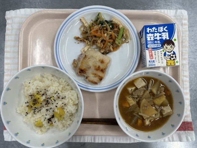令和7年10月8日 公開日 2025/10/08 更新日 2025/10/08 給食 ☆今日の献立☆・栗おこわ・鶏肉の塩こうじ焼き・おひたし・豚汁・牛乳※写真は高学年の量です。☆食材の産地紹介栗(愛媛) 鶏肉(鹿児島) こまつな(東京) にんじん(北海道) もやし(栃木) だいこん(北海道)ごぼう(青森) 豚肉(鹿児島) えのきたけ(新潟) いいね(0)