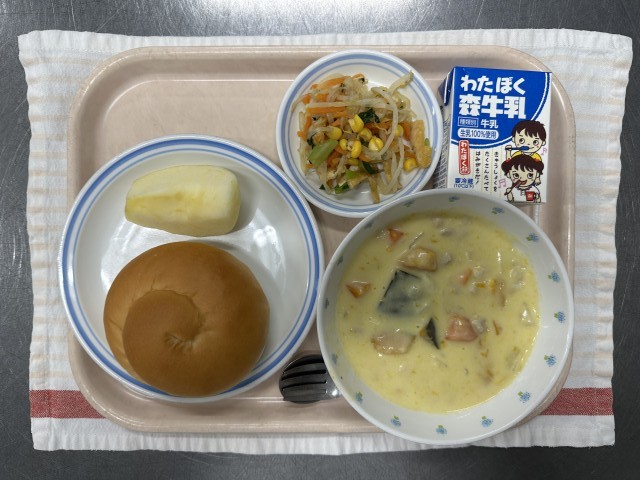 令和7年10月30日 公開日 2025/10/31 更新日 2025/10/31 給食 ☆今日の献立☆・ミルクパン・かぼちゃのクリームシチュー・こんがりキツネの和風サラダ・りんご・牛乳※写真は高学年の量です。☆食材の産地紹介 たまねぎ(北海道) 鶏肉(岩手) にんじん(北海道) かぼちゃ(北海道)こまつな(東京) もやし(栃木) きゅうり(宮崎) りんご(長野) いいね(0)