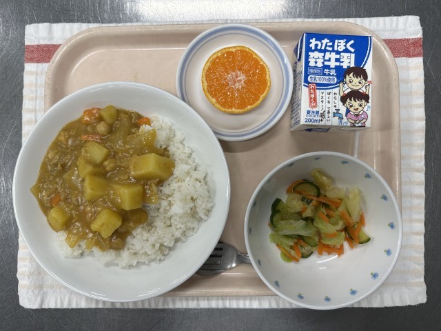 令和7年11月28日 公開日 2025/11/28 更新日 2025/11/28 給食 ☆今日の献立☆・ポークカレーライス・ゆで野菜レモン醤油がけ・みかん・牛乳※写真は高学年の量です。☆食材の産地紹介にんにく(青森) しょうが(高知) たまねぎ(北海道) 豚肉(岩手) にんじん(千葉) じゃがいも(北海道)キャベツ(愛知) きゅうり(宮崎) みかん(熊本) いいね(0)