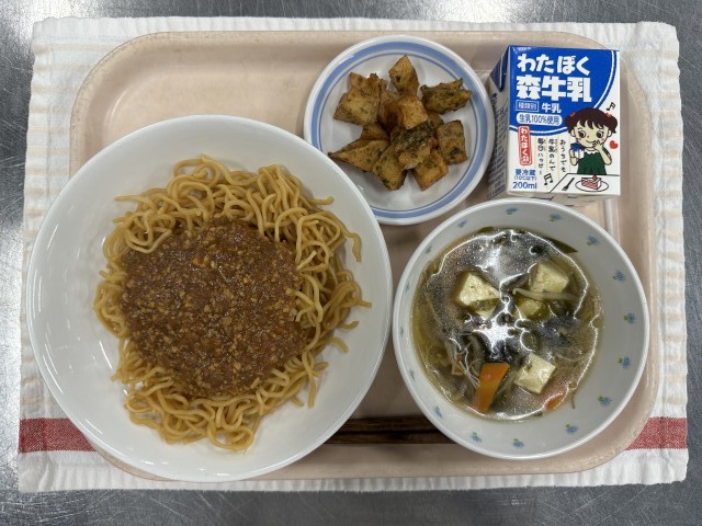 令和7年12月11日 公開日 2025/12/11 更新日 2025/12/11 給食 ☆今日の献立☆・ジャージャー麵・おこのみポテト・わかめスープ・牛乳※写真は高学年の量です。☆食材の産地紹介しょうが(高知) にんにく(青森) にんじん(千葉) たまねぎ(北海道) ねぎ(埼玉) 豚ひき肉(鹿児島)じゃがいも(北海道) もやし(栃木) えのきたけ(新潟) いいね(0)