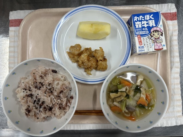 令和8年1月9日 公開日 2026/01/09 更新日 2026/01/09 給食 ☆今日の献立☆・赤飯・魚の東煮・具だくさんすまし汁・りんご・牛乳※写真は高学年の量です。☆食材の産地紹介たら(アメリカ) にんじん(千葉) はくさい(群馬) さといも(愛媛) こまつな(東京) りんご(長野) いいね(0)