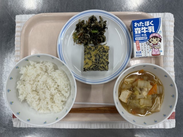 令和8年1月20日 公開日 2026/01/22 更新日 2026/01/22 給食 ☆今日の献立☆・ごはん・ひじき入り卵焼き・野菜の海苔和え・白菜のみそ汁・牛乳※写真は高学年の量です。☆食材の産地紹介鶏ひき肉(宮崎) ねぎ(千葉) こまつな(東京) もやし(栃木)にんじん(千葉) はくさい(群馬) えのきたけ(長野) いいね(0)