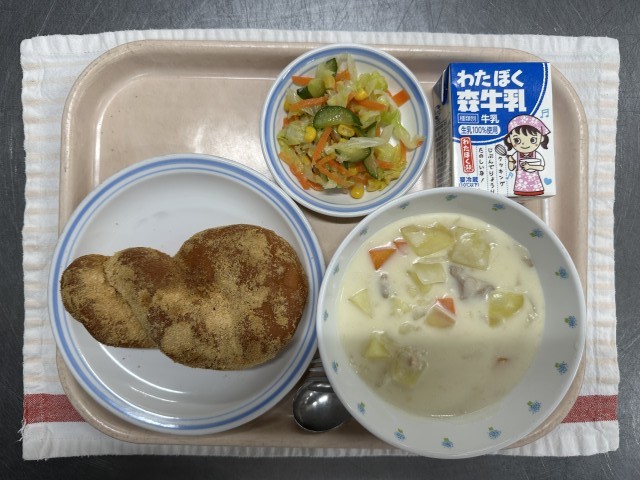 令和8年1月28日 公開日 2026/01/28 更新日 2026/01/28 給食 ☆今日の献立☆・きなこ揚げパン・クリームシチュー・コールスローサラダ・牛乳※写真は高学年の量です。☆食材の産地紹介たまねぎ(北海道) にんじん(千葉) 鶏肉(鹿児島) じゃがいも(長崎) キャベツ(愛知) きゅうり(宮崎) セロリ(静岡) いいね(0)