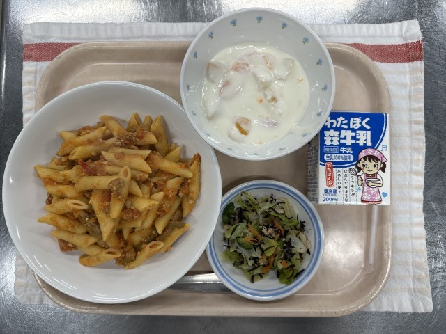 令和8年2月10日 公開日 2026/02/10 更新日 2026/02/10 給食 ☆今日の献立☆・ペンネボロネーゼ・ツナひじきサラダ・フルーツヨーグルト・牛乳※写真は高学年の量です。☆食材の産地紹介にんにく(青森) 豚ひき肉(鹿児島) たまねぎ(北海道) にんじん(千葉) セロリ(静岡) ピーマン(茨城) キャベツ(群馬) きゅうり(埼玉) いいね(0)