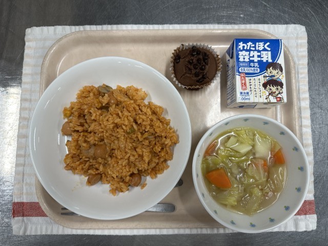 令和8年2月13日 公開日 2026/02/19 更新日 2026/02/19 給食 ☆今日の献立☆・チキンライス・野菜スープ・チョコもっちー・牛乳※写真は高学年の量です。☆食材の産地紹介にんにく(青森) 鶏肉(鹿児島) たまねぎ(北海道) ピーマン(茨城)にんじん(千葉) キャベツ(群馬) じゃがいも(北海道) いいね(0)