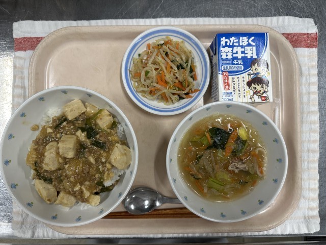 令和8年2月16日 公開日 2026/02/19 更新日 2026/02/19 給食 ☆今日の献立☆・麻婆丼・ナムル・春雨スープ・牛乳※写真は高学年の量です。☆食材の産地紹介にんにく(青森) しょうが(高知) 豚ひき肉(岩手) たまねぎ(北海道) にら(栃木) にんじん(千葉) もやし(栃木) こまつな(東京) 豚肉(岩手) だいこん(千葉) ねぎ(千葉) いいね(0)