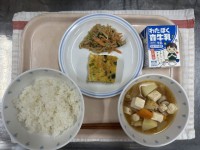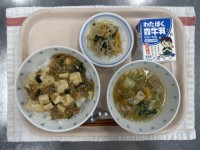 ☆今日の献立☆・麻婆丼・ナムル・春雨スープ・牛乳※写真は高学年の量です。麻婆丼の...