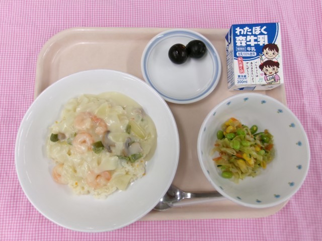 その時先生は、にんじんと答えています。にんじんはビタミンAなどの栄養がたっぷりと含まれていること、様々な料理に合うこと、そして彩りがあざやかになるから給食にもよく使っているのだと思います。見た目や香りも、食事をする時にとても重要な決め手になります。今日もにんじんはエビクリームライスにグリーンサラダにも使われています。よく味わっていただきましょう。