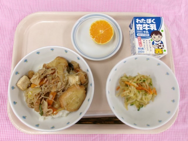 今日の給食は油麩というお麩を使ったすきやき丼です。