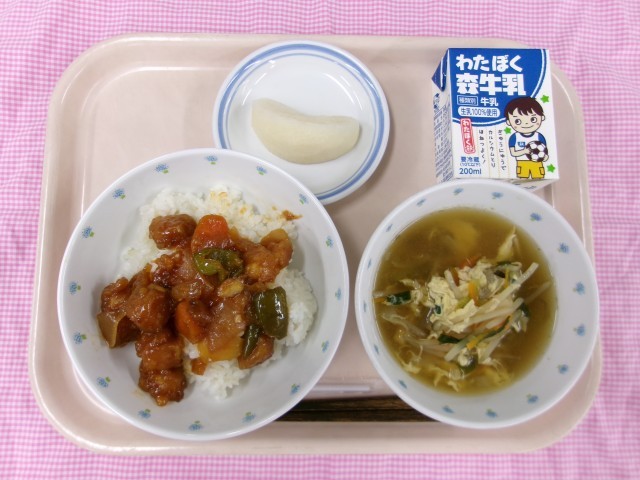 今日の給食は鱈の酢豚風ごはんです。烏森小学校では数カ月に1度給食に出ている定番メニューですね。鱈は低脂肪、高たんぱくのお魚です。身もホロホロとほぐれる柔らかさで調理もしやすく今日のように揚げる調理法にも適しています。