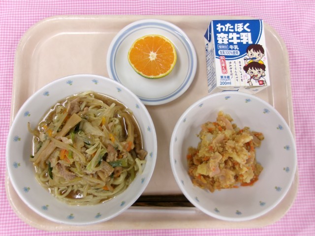 今日の給食はサンマ—麺です。サンマー麺は、神奈川県横浜市のご当地ラーメンのことです。サンマ—麺と聞くと魚の秋刀魚イメージするかもしれませんが、秋刀魚とはまったく関係のない、野菜のあんかけラーメンのことです。サンマ—麺の「サン」は「新鮮でシャキシャキした」、「マー」は「上にのせる」という意味があり、新鮮な野菜と肉をさっと炒めて、シャキシャキ感があるとろみのついた具を、麺の上にのせることから、サンマ—麺と名付けられたといわれています。しっかりと食べて運動会に備えましょう。