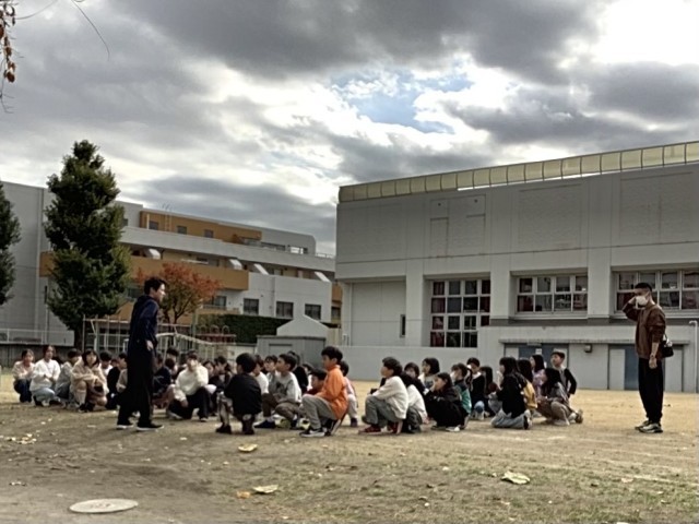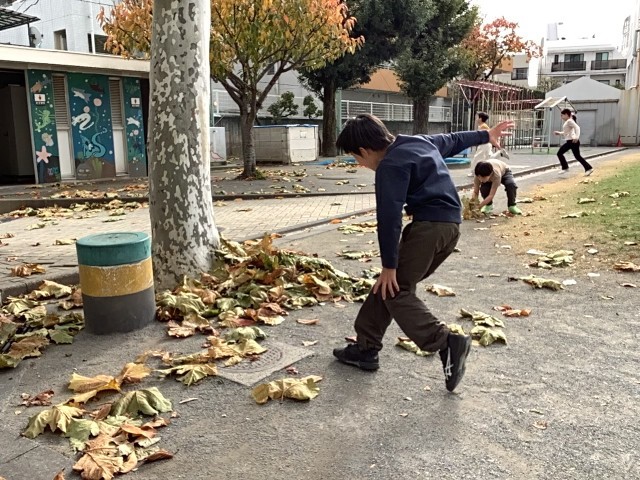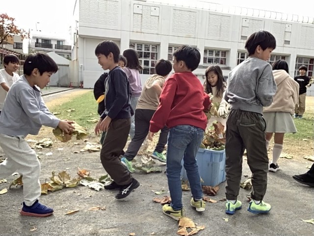 11月18日(火)掃除の時間、3−2と4−2が落ち葉ひろいを行いました。始まりの掛け声がかかると、落ち葉に向かって一目散!あっという間に箱がいっぱいになりました。主事さんに「まだまだ入るよ!」と足で踏んでたくさん入れる方法を教えていただきました。きょうだい学年で協力して活動しました。