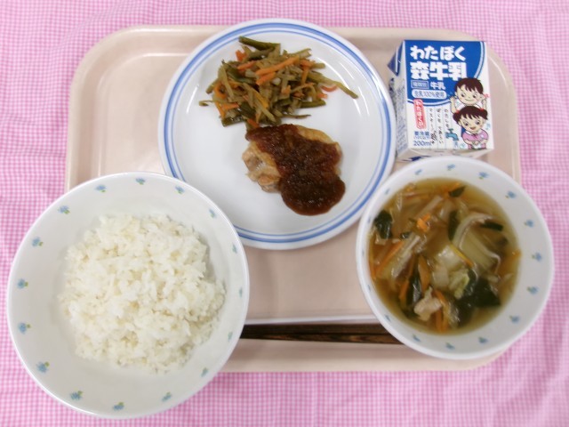 今日の給食は鶏肉のアップルソースかけです。