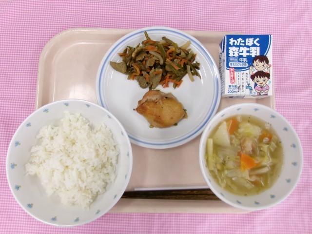 今日の給食はくきわかめのきんぴらです。くきわかめは名前の通り、普段よく食べているわかめの茎の部分です。ちなみに根元もめかぶとして食べられています。くきわかめはコリっとした食感がくせになりますね。今日はごはんのおかずにもなる味付けに仕上げています。ごはんと一緒に召し上がれ。