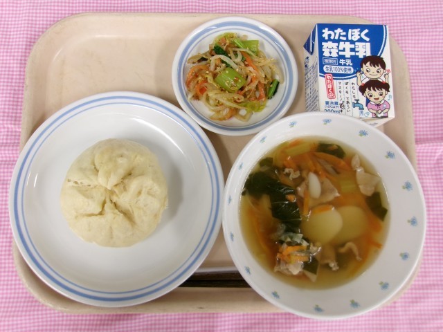 現在は、コンビニなどでも色々な味つけのものも出ていますね。今日は、給食室で小麦粉・ベーキングパウダー・ラード・砂糖・塩で作った中華まんの「皮」にひき肉と野菜をしょうゆとごま油で味付けした「肉あん」を包んで蒸しました。
