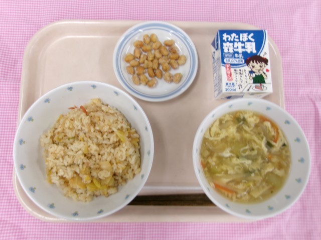 青のり大豆、スパイシービーンズに続いて大豆をメインにした料理の新メニューです。作り方は水で戻した大豆を油で揚げます。そのあと、砂糖をとかした水でじっくりと炒ります。砂糖を焦がさないように低めの温度でじっくりと炒るのがポイントです。大豆は畑のお肉とも呼ばれ、タンパク質や良質な脂質を含んでいます。大豆はみなさんにぜひ食べてもらいたい食材なので、給食ではあらゆる工夫をして使うようにしています。今日も良く噛んでおいしくいただきましょう。