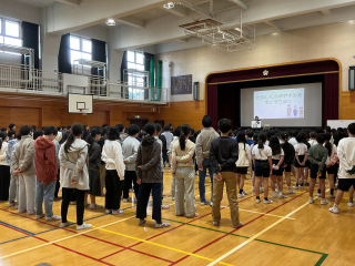 体育館で後期前半終了、冬休みに向けての朝会がありました。