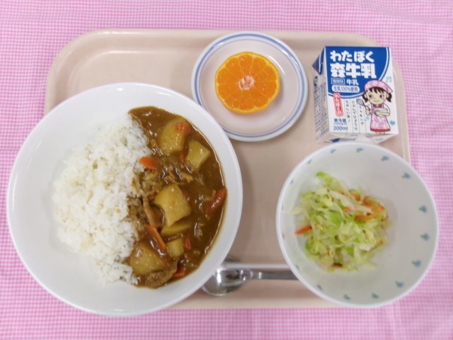 今日の給食はカレーライスです。最近はインドカレーやタイカレー、スープカレーなど本格的なお店やスパイスを工夫した店なども増えていますね。日本のカレーライスの始まりは、インドからイギリス経由で入って来たもので独自に進化したカレーライスです。学校給食や家庭で普及したことから日本ならではの料理にもなりました。最近ではインド人にも日本のカレーが美味しいと評判になっているそうです。今日は、ルウから手作りした烏森小特製のカレーライスです。落ち着いて美味しくいただきましょう。