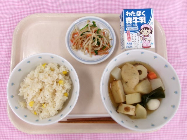 今日の給食はコーン茶飯、おでんです。