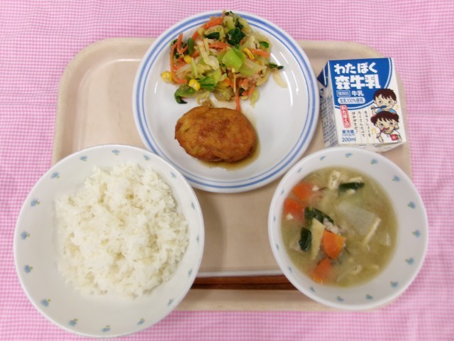 今日の給食はゼリーフライです。名まえにゼリーが付くのでゼリーと関係があるの?と思う人もいるかとしれませんが、実は関係がありません。ゼリーフライの名まえの由来ですが、小判のような形が関係していると言われています。「銭フライ」と呼ばれていたのが変化して、ゼリーフライと呼ばれるようになりました。ゼリーフライはたくさんのおからとじゃがいもがベースになっていて、そこににんじんやねぎなどの野菜が入っているのが特徴です。今日はウスターソースをフライにかけていただきます。今日もおいしくいただきましょう。
