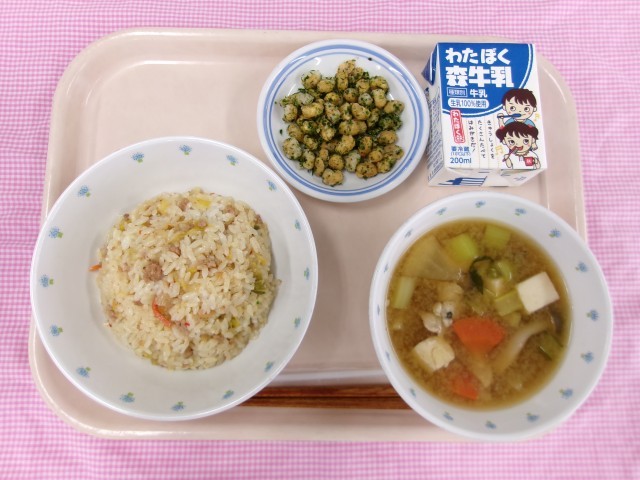 今日の給食はキムチごはんとのり塩大豆です。