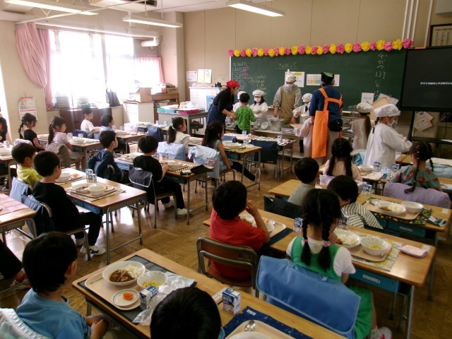 小学校初めての給食はカレーライスでした。6年生と同じ味付けで少し大人の味つけだったかもしれませんが、良く食べていました。