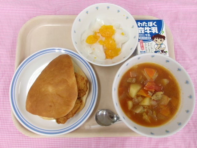 今日の給食は白身魚をフライにしてパンにはさんだフィッシュバーガーです。魚は「メルルーサ」という名前で鱈の仲間です。