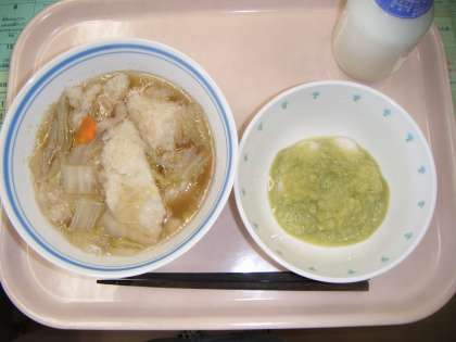 今日の給食には、東北の郷土料理のきりたんぽとずんだ白玉を出しました。