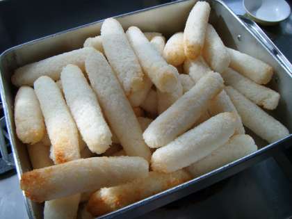 きりたんぽは、炊いたお米を棒に巻き付けて焼いたものです。今日は、朝から調理員総出できりたんぽを手作りしました。しかし、汁に入れて少し煮込んだところ、ほとんどが汁の中に溶け、形がなくなってしまいました・・。子どもたちに正しいきりたんぽを味わってもらうために、また次の機会にチャレンジしたいと思います。