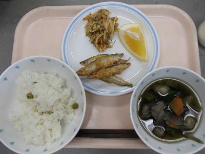今日は、2年生がさやむきをしたグリンピースを使って、ピースごはんを作りました。