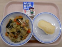 今日の給食は、ごはん・豆腐入りハンバーグ・ビーフン炒め・みそ汁・牛乳でした。かぼ...
