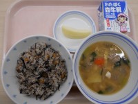今日の給食は、ジャンバラヤ・クラムチャウダー・菊花みかん・牛乳でした。鶏肉(静岡...