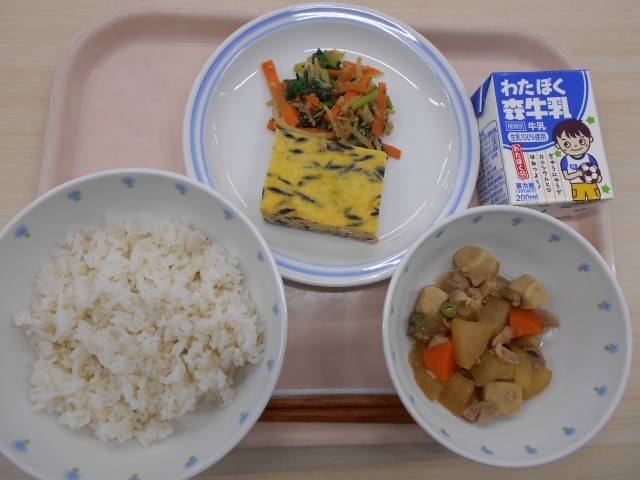 今日の給食は、ごはん・ひじき入り卵焼き・ごま和え・冬瓜と鶏肉の煮物・牛乳でした。