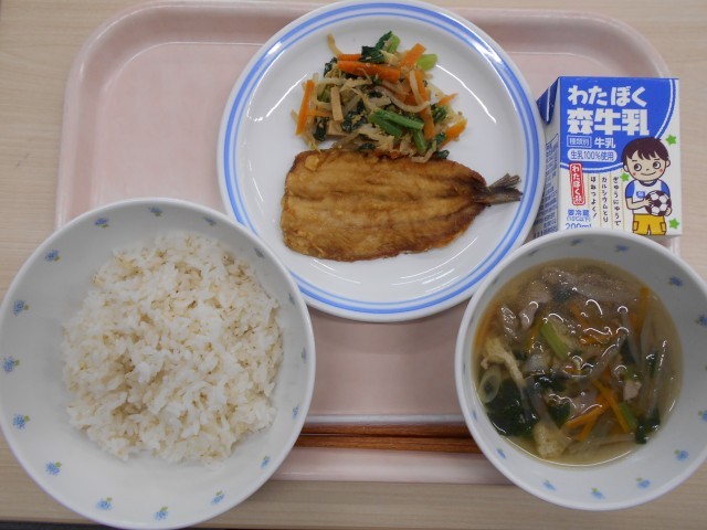 今日の給食は、ごはん・いわしの蒲焼き・野菜の高野和え・沢煮椀・牛乳でした。