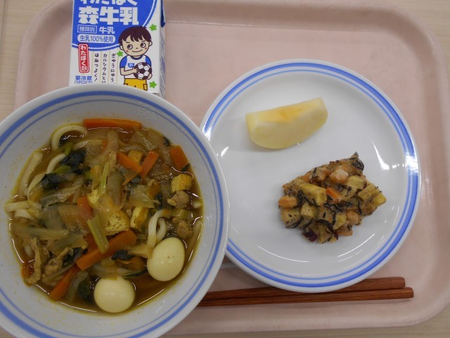 今日の給食は、カレーうどん・岩石揚げ・トキりんご・牛乳でした。
