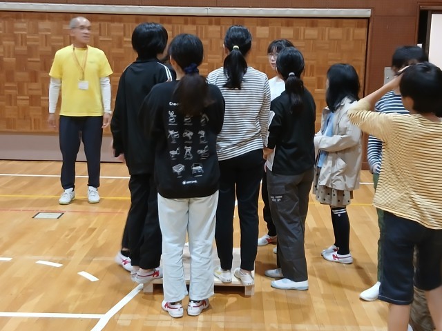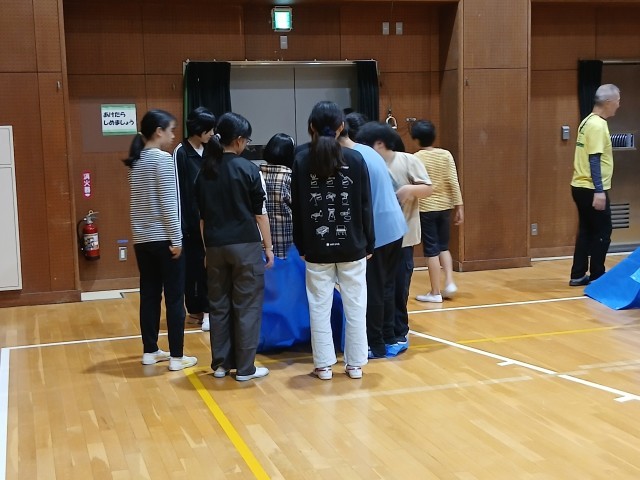 板の上に全員で乗るものと、全員乗っているブルーシートを乗ったまま裏返すものでした。