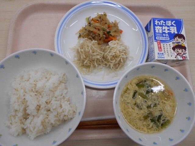 今日の給食は、ごはん・花しゅうまい・大根とじゃこのサラダ・ニラと卵のスープ・牛乳でした。