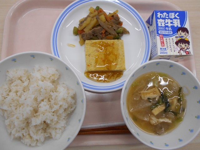 今日の給食は、ごはん・ぎせい豆腐あんかけ・じゃがいもの金平・みそ汁・牛乳でした。