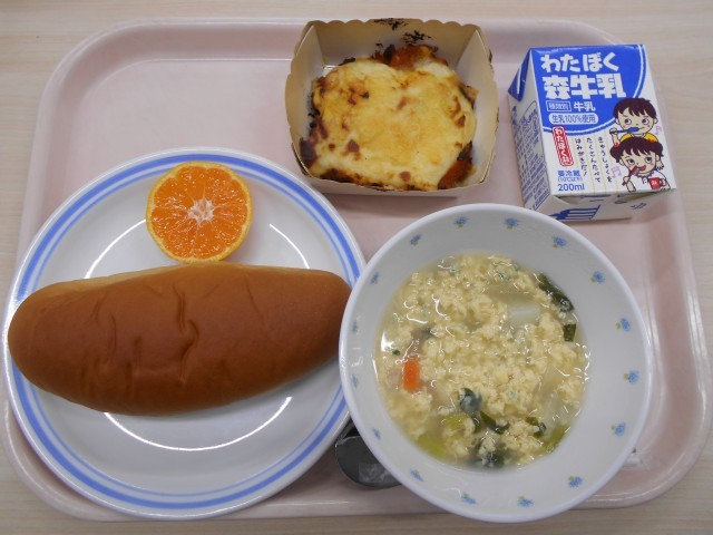 今日の給食は、黒砂糖パン・かぼちゃのグラタン・ふわふわスープ・牛乳でした。