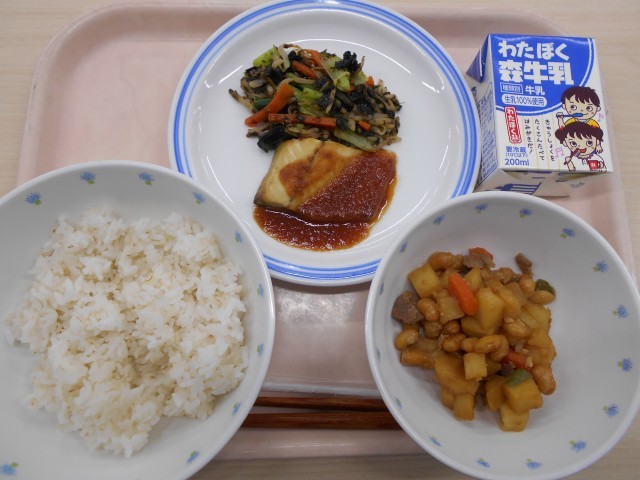 今日の給食は、ごはん・さばのごまみそあんかけ・野菜ののり和え・変わり五目豆・牛乳でした。