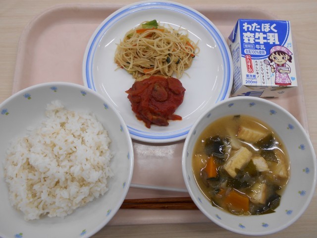 今日の給食は、ごはん・豆腐入りハンバーグ・ビーフン炒め・みそ汁・牛乳でした。
