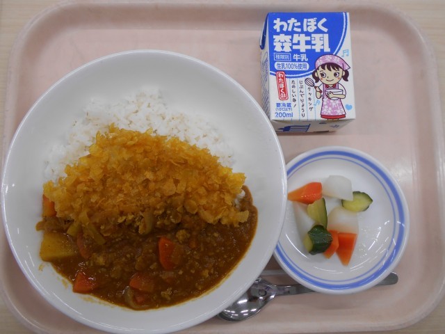 今日の給食は、カレーライス・パリパリチキンカツ・カラーピクルス・牛乳でした。