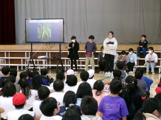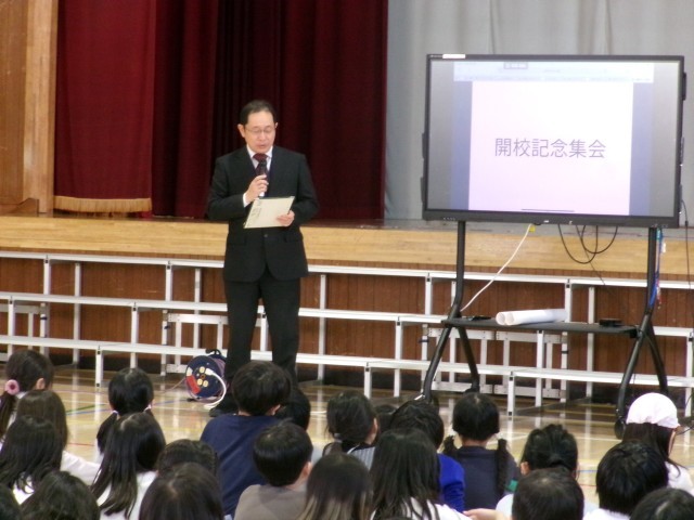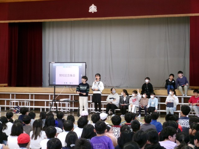 集会委員会の児童が向原小にちなんだクイズを出してくれました。最後に校長先生からお話をいただき、全校で開校記念のお祝いをしました。