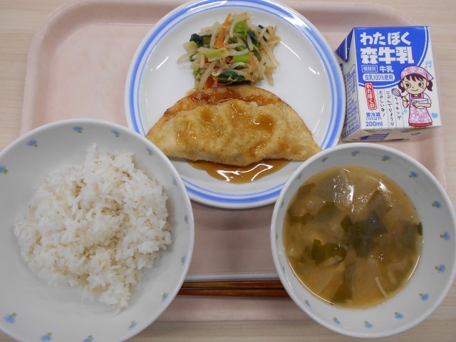 今日の給食は、ごはん・ジャンボ餃子甘酢あん・青菜ともやしのナムル・みそ汁・牛乳でした。