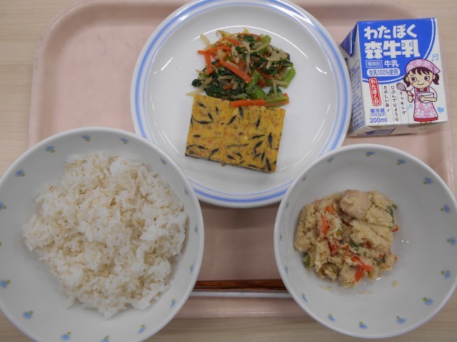 今日の給食は、ごはん・ひじき入り卵焼き・ごま和え・卯の花・牛乳でした。