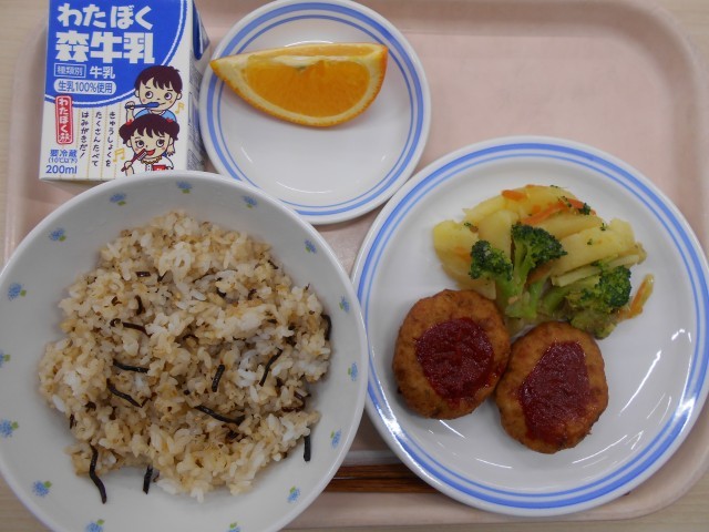 今日の給食は、こんぶごはん・豆腐のナゲット・ポテトとブロッコリーのソテー・いよかん・牛乳でした。