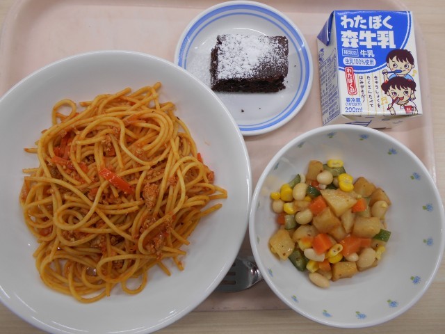 今日の給食は、スパゲティナポリタン・じゃがいもと彩り野菜のサラダ・チョコケーキ・牛乳でした。