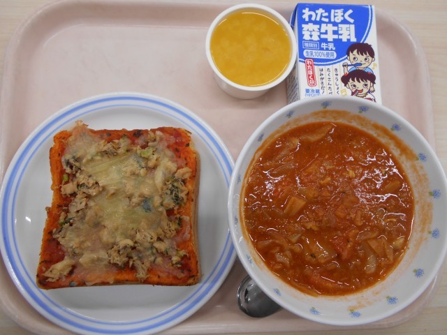 今日の給食は、ツナピザトースト・ミネストローネ・オレンジゼリー・牛乳でした。