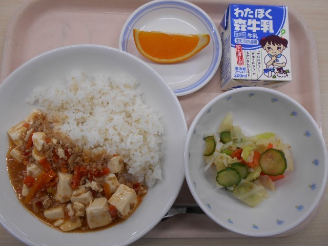 今日の給食は、ごはん・西湖豆腐・野菜のさっぱり漬け・清見オレンジ・牛乳でした。