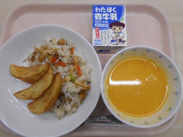 今日の給食は、じゃこべえピラフ・カントリーポテト・キャロットスープ・牛乳でした。